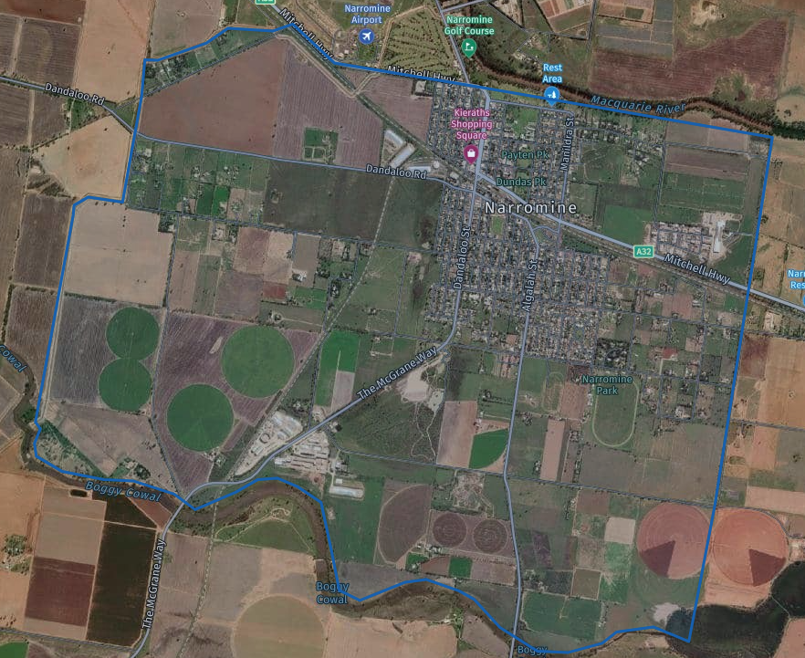 - North bound - Mitchell Highway (properties west of Dandaloo Street) and Macquarie River (propoerties east of Dandaloo Street).