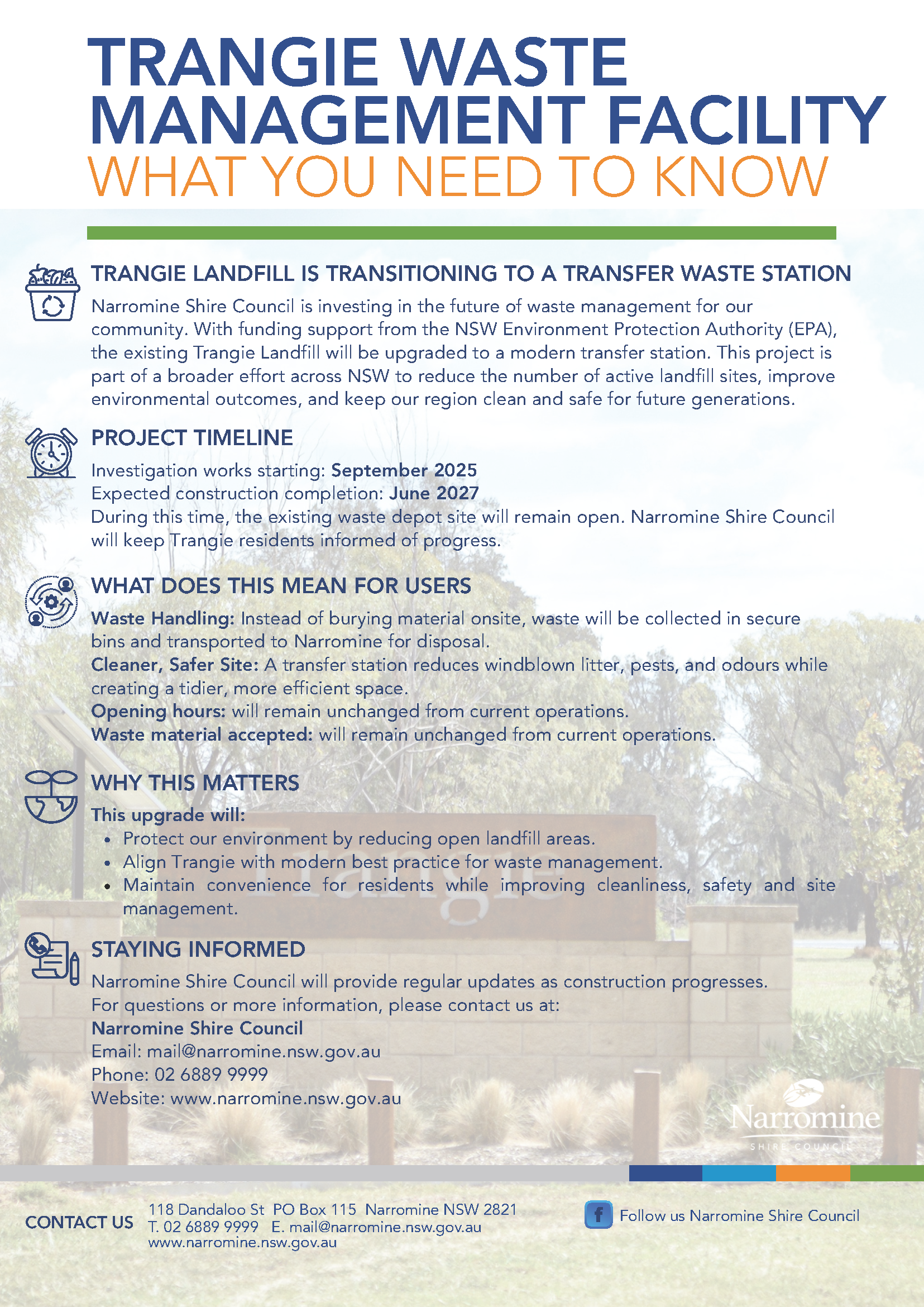 Narromine Shire Council advises all residents that Narromine and Trangie Waste Facilities will be closed on 24 October 2025.